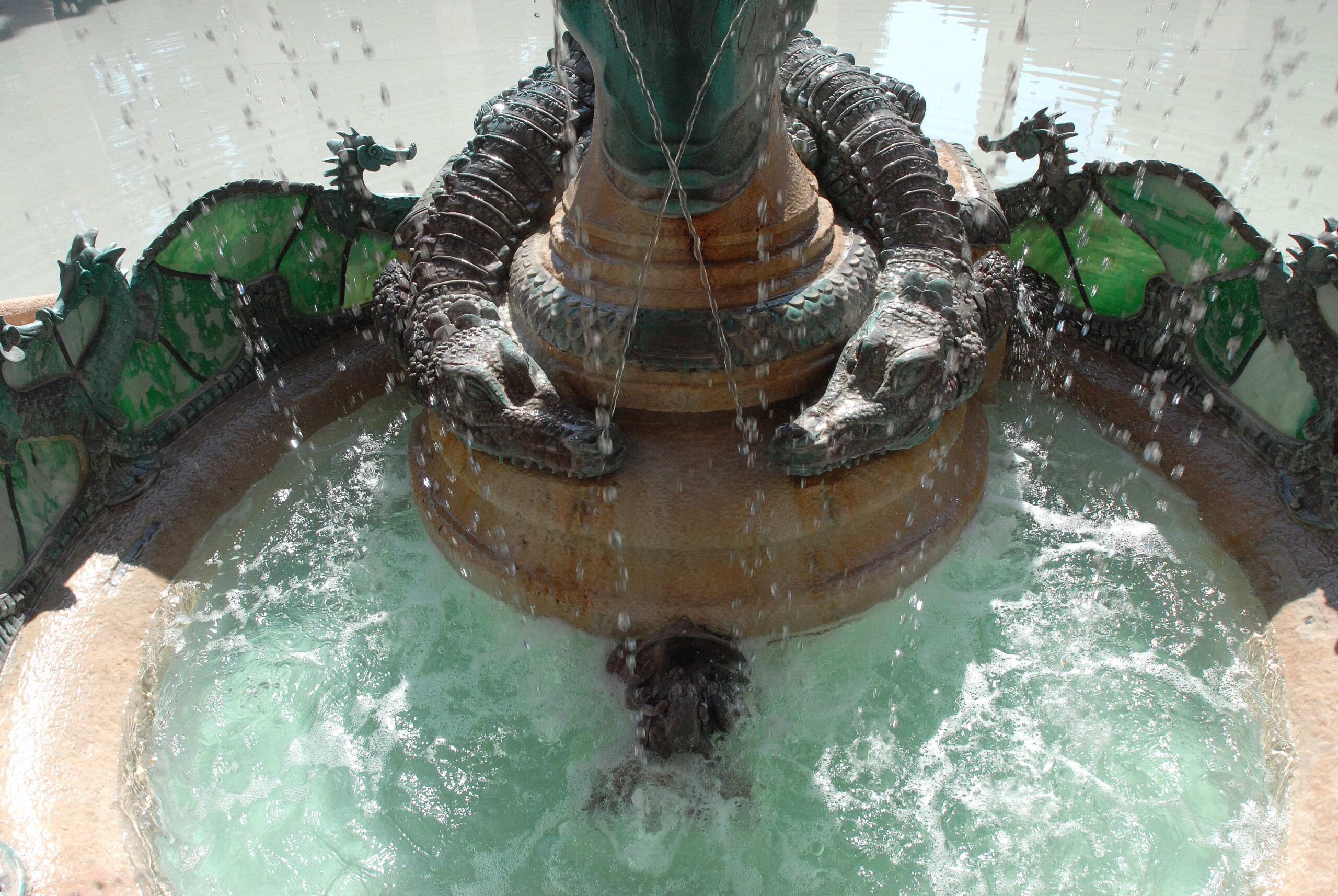 Questa suggestiva fontana è caratterizzata da due coccodrilli di bronzo che sorreggono una conchiglia di granito scuro del Labrador. Da qui, la sorgente del Tettuccio sgorga in un’ampia vasca circolare di travertino, elegantemente decorata con cavallucci marini e blocchi di vetro verdi.
