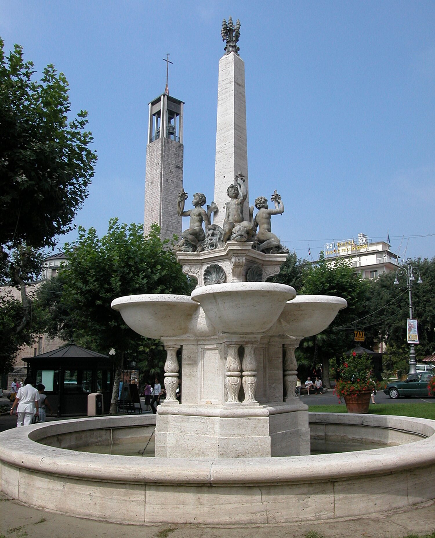 La sua costruzione segnò la sostituzione di una preesistente loggetta quadrangolare che, fin dal 1834, aveva ospitato mercati e fiere agricole. La fontana, realizzata in travertino e bronzo, è composta da un ampio bacino circolare. Sulla sommità di quest’ultimo sono collocati dei putti che impugnano quattro corni, dai quali fuoriescono i getti d’acqua che alimentano la vasca sottostante.
