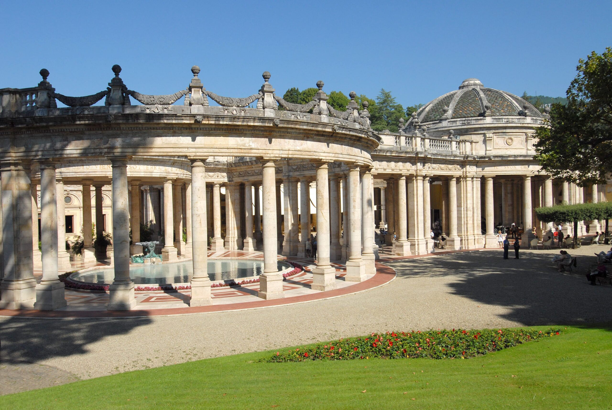 Lo stabilimento Regina, edificato tra il 1927 e il 1929, rappresenta un perfetto esempio di come l’architettura termale abbia saputo rinnovarsi pur mantenendo un dialogo con la tradizione. La facciata maestosa, con le sue colonne e il timpano che richiamano i templi classici, introduce a interni dove il marmo bianco diventa protagonista.